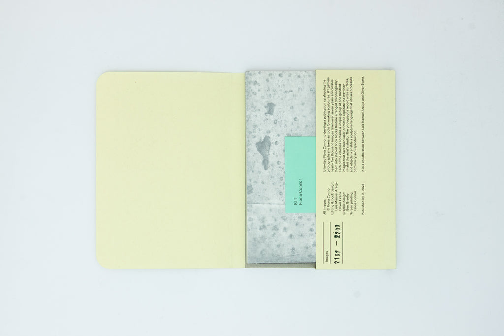 KIT is a series of forty-nine unique artist books, each comprising a different group of one hundred photographs on sheets of recycled paper, bound by five heavy-duty staples. The images are laser-printed single-sided in black and white to replicate how they inhabit the artist’s studio. The book blocks are housed in custom-made manilla folders, with graphic design by Ben Greehy and screen printed by Fiona Connor. An insert card accompanies this project, providing an index of the different cover pages.