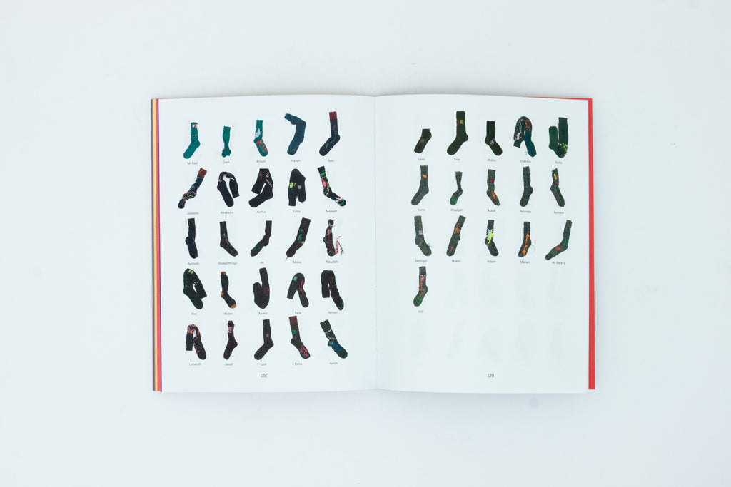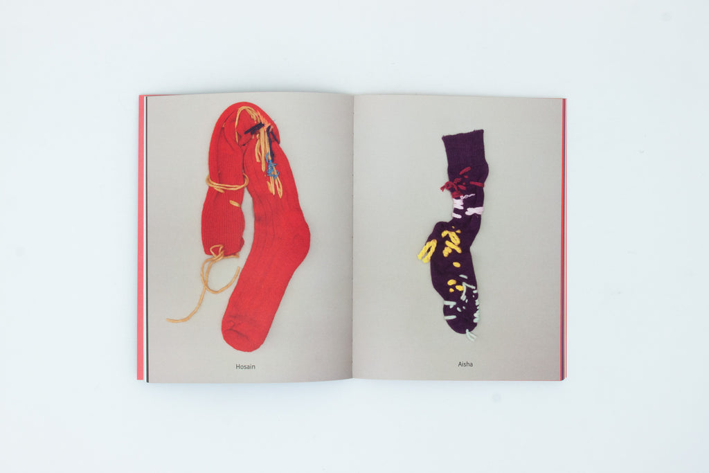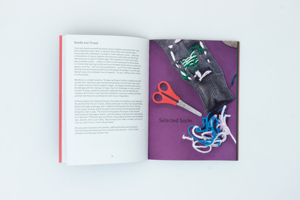 SOCKS celebrates the everyday act of mending socks through darning. An illustrated account of what happens when you teach a whole primary school how to darn a sock. Central to the book is a vibrant, colourful library of 488 socks, each stitched and darned by the Surrey Square Primary School community in Southwark using industry ‘warehouse’ waste socks. Children, staff and families of the school, learnt and practised their darning and stitching skills on socks, during a series of 26 workshops facilitated by Pym in early 2024.