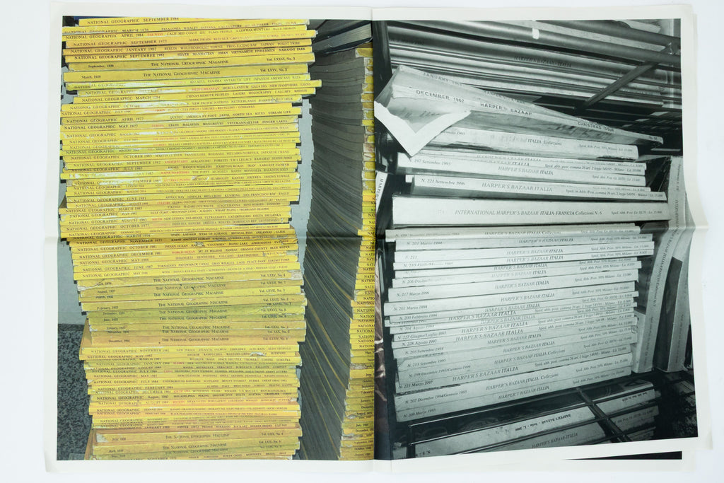 Spines is a limited-edition newspaper featuring a collection of photographs by Julie Peeters, created to accompany the exhibition 2019, curated by Raimundas Malašauskas and Tom Engels at Grazer Kunstverein. In Peeters’ photographs from 2023 and 2024, magazines from the Milano Fashion Library stack like layers of sediment—decades of aesthetic history compressed into a single frame, each image carrying a quiet density of time. They reflect the archive’s paradox: vast reservoirs of culture, their treasures tantalizingly concealed behind the orderly facades of stacked spines.