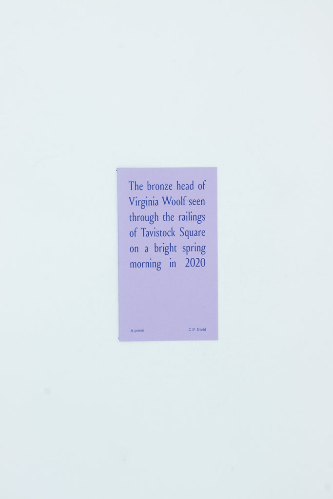 Previously published in The Spectator, the poem is presented with a specially commissioned photograph of Stephen Tomlin’s bust of Woolf in Tavistock Square.