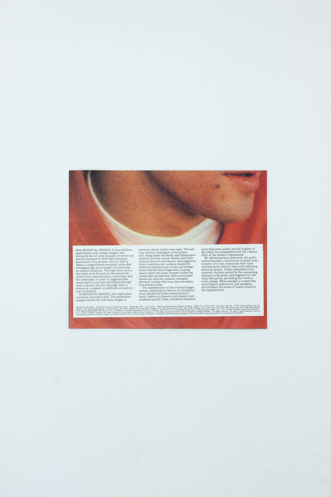 With Residual Bodies, Forma Editions experiments with vintage imagery and the tactile feel of print on paper. It revisits an interest explored in 2016 when the press launched its first project, Not For Sale to Minors, a large-format newsprint series that reimagined gay porn imagery by removing its explicit elements. Through three issues, that early work focused on the tension between erotic representation, censorship, and the materiality of print. It suggested that queer desire is not only articulated through what is shown, but also through what is obscured, cropped, or withheld, an exploration of absence.