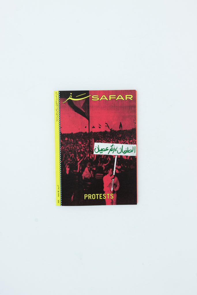 "Journal Safar's 9th issue is Protests. To protest is a fundamental human act against injustice. It takes many forms: the defiant act of existing, the organized resistance of multitudes, armed struggles, and the disruption of systems through speech, action, and refusal in person, in prints and slogans online, or on the streets. Some forms of protest require symbols, flags, and specific attire, while others are carried out through non-verbal communication, secret dissemination, and ideological discipline. Yet all of them need cultural carriers–our bodies, our stories, and our marks to hold what can be remembered and learned from. Whether explicit or invisible, in communities or in solitude, this issue explores why we protest, and how, in the hopes of sparking solace, solidarity, and action. In this issue: Maya Saikali sits down with Gérard Paris-Clavel, a co-founder of the pioneering Grapus Collective, to talk political image-making and the life of the image. Gérard delves into his own work and where it survives, “I don’t do exhibitions, I do demonstrations.” An illustrated Toolkit for Actions by Palestine Action makes direct action tactics accessible to anyone ready to confront the international system complicit in the Palestinian genocide. Two conversations by Maya Moumne: with Adbusters Magazine founder Kalle Lasn on the power of artists in revolutions, and with Ahmad Swaid, editor of Dazed MENA and former Editor-in-Chief of GQ Middle East, on censorship, identity, and building new cultural platforms across the region. While Audrey Tseng and Chong Gu write on Red Canary Song, a grassroots collective of Asian and migrant sex workers, massage workers, and allies of the Asian diaspora, that resist policing through notions of homemaking. These highlights sit alongside stellar contributions by Alina Lupu, Ahmad Zaghmouri, Muhannad Hariri, Elias Erkan, Bettina Nagler, Rasha Dakkak, Yaa Adae, and Nihal ElAasar. And for the first time: another magazine inside this magazine: Design Drafts #3, a collaboration with Nieuwe Instituut, on protest and design with contributions by Tala Abdalhadi, Myriam Amri, Shruti Hussain, Candice Jensen, and Alice Wan on the theme of protest and design."