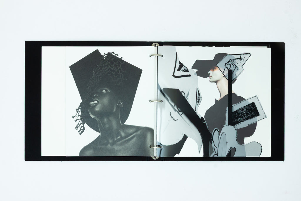 A dynamic photographic look book produced by Yohji Yamamoto in collaboration with design duo M/M [Paris] with styling by Joe McKenna. The book plays with a variety of paper stocks including transparent acetate overprinted with surreal objects to create a collage, multilayered scenography for Yohji's clothing.